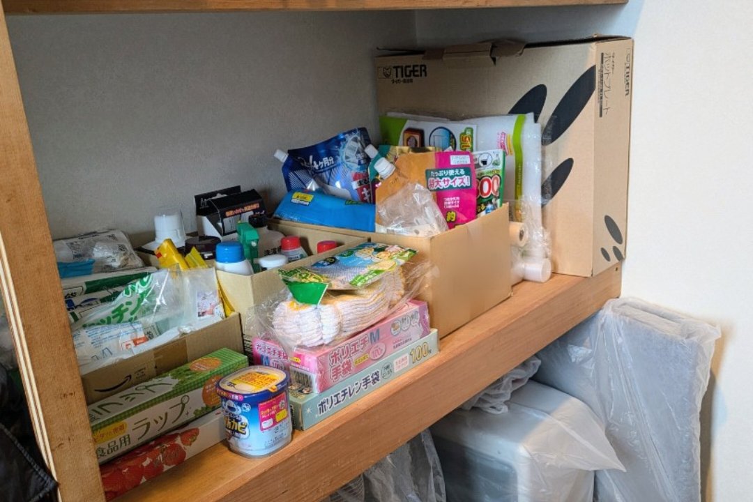 暮らしの中で動き続けるもの・防災備蓄を、出し入れしやすい中段に収めました。