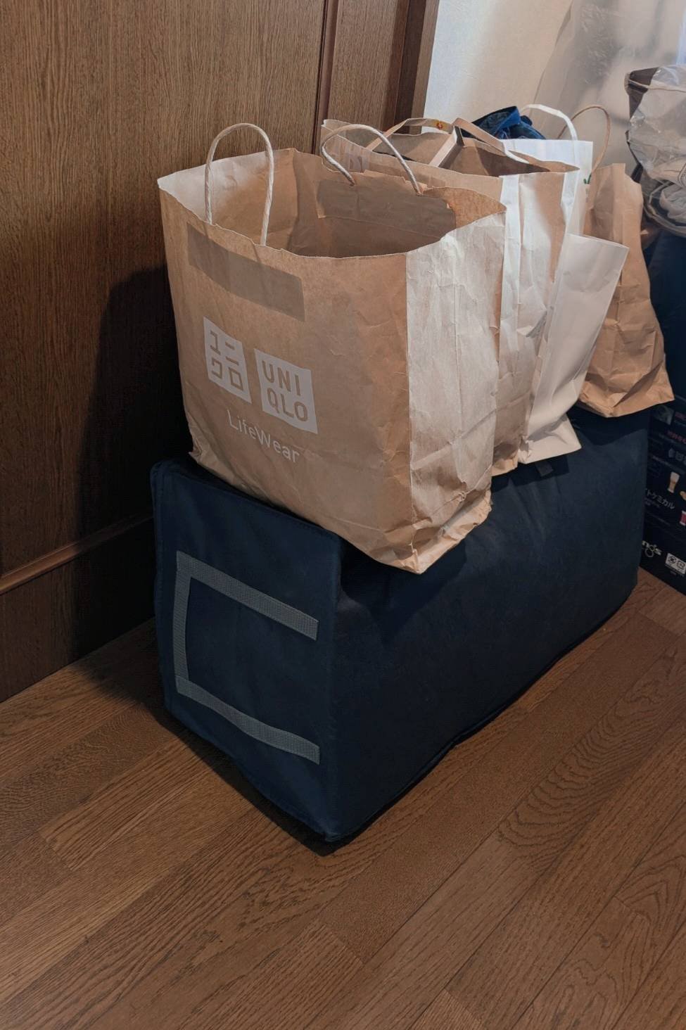 棚に収納出来なかった衣類は入り口にまとめました。