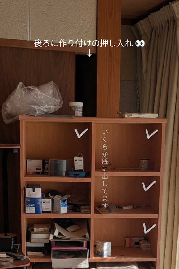 大きな収納棚に、ご家族様の趣味のものがたくさん入っています。他にも どこに入れるか迷われたようなものが床にありました。